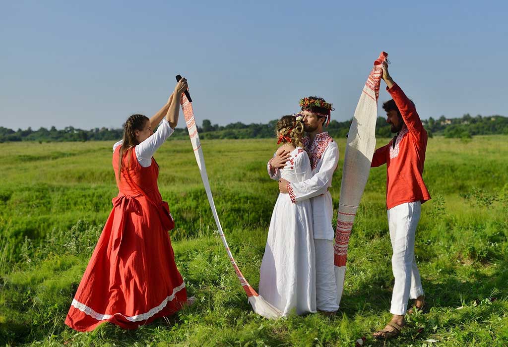 Рушником на свадьбе связывают руки молодоженам, чтобы сделать их любовь крепкой и неразрывной, его кладут под ноги в церкви или ЗАГСе, чтобы пара получила защиту в момент перехода в новую жизнь, украшают караваи и иконы.