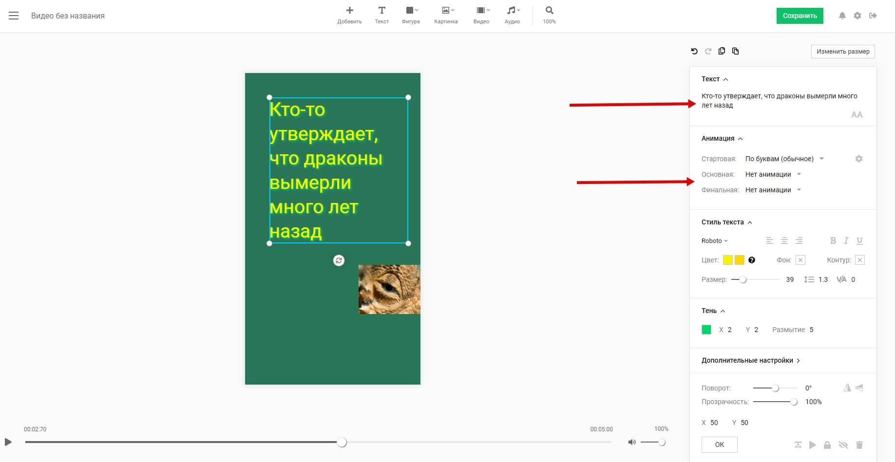 Теперь добавьте текст на слайд. Прописывать его следует в меню справа, там же настройте тип появление или исчезания текста. Можно выбрать анимацию как для появления текста на странице, во время показа текста или применить движение к окончанию показа.