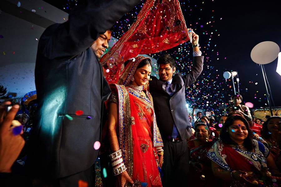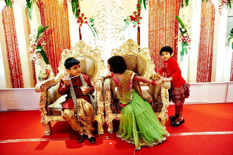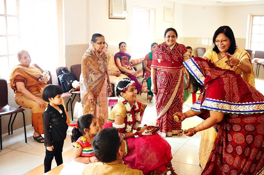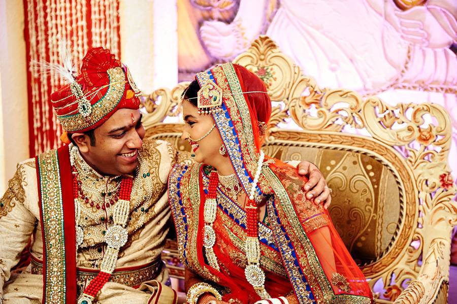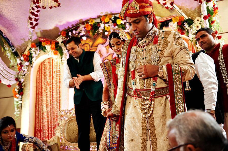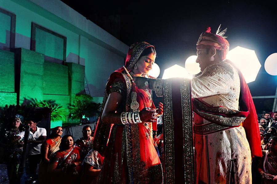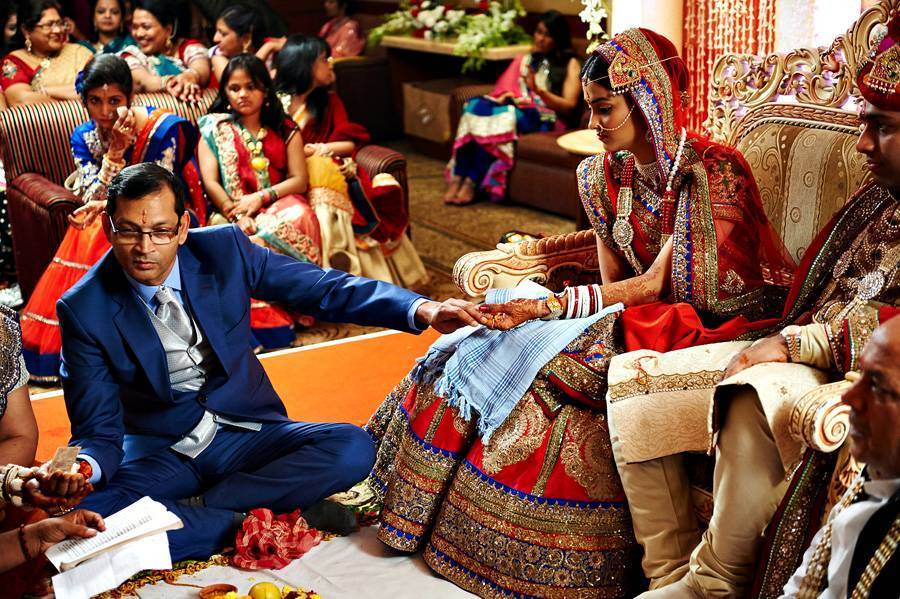 Для венчания сооружается маленький свадебный храм «веди» из пяти бамбуковых палок, которые сверху накрываются тентом. Внутри храма зажигается огонь. Один конец сари невесты привязывают к кушаку жениха, чтобы объединить их навеки. Молодожены садятся возле огня.