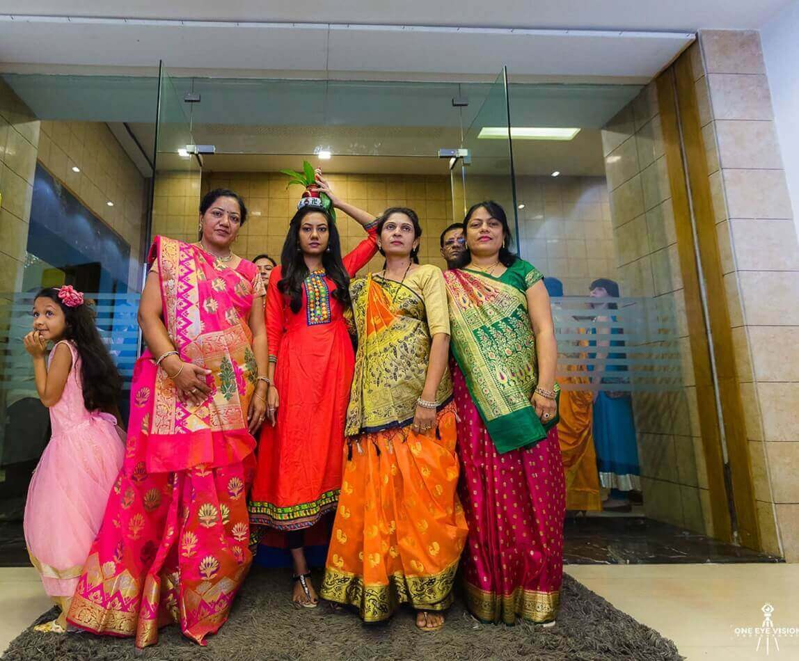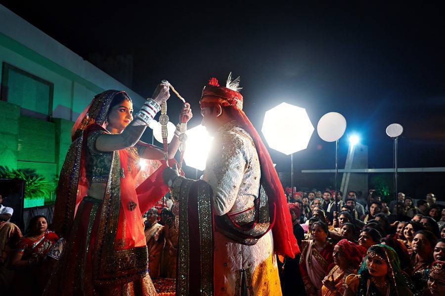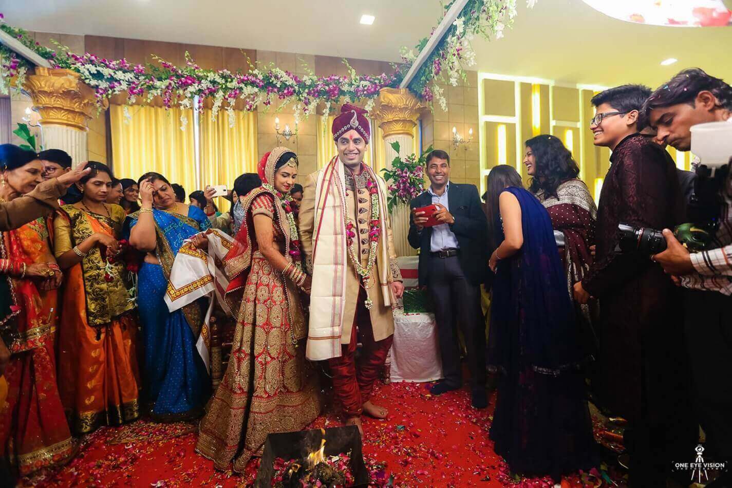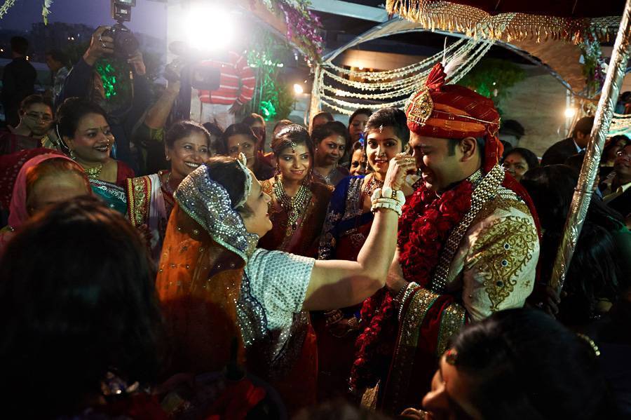 Для венчания сооружается маленький свадебный храм «веди» из пяти бамбуковых палок, которые сверху накрываются тентом. Внутри храма зажигается огонь. Один конец сари невесты привязывают к кушаку жениха, чтобы объединить их навеки. Молодожены садятся возле огня.