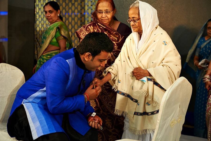 Согласие на брак жених выражает тем, что украшает пробор будущей супруги краской из куркумы и одаривает её золотым ожерельем. Теперь пришёл черёд угощениям. Сладости, которые предлагает супруг своей избраннице, символизируют сладкую будущую совместную жизнь.