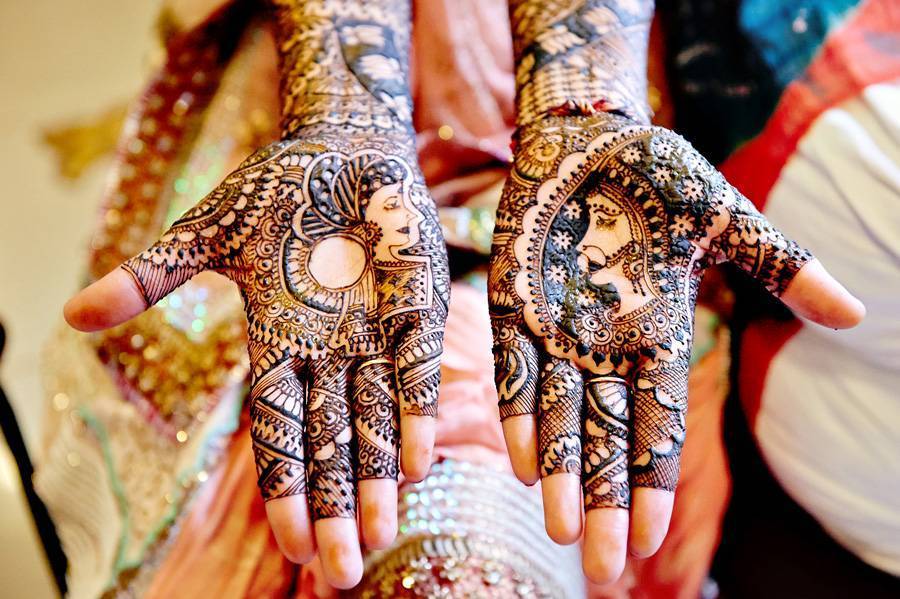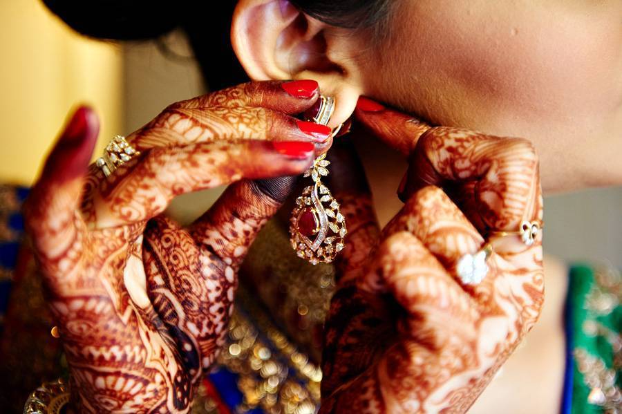 Маникюр должен быть скромным, подойдут однотонные ноготки пастельного оттенка или классический французский вариант. Подчеркнуть принадлежность к индийскому стилю можно с помощью мехенди – росписи тела хной в виде узоров с множеством мельчайших деталей. Такие рисунки обычно делают на руках и ногах невесты. Шею, уши, руки, ноги и голову нужно украсить множеством крупных украшений из благородных металлов с драгоценными камнями.