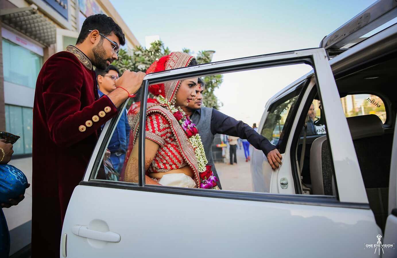 По индийской традиции жених приезжает за невестой на белом коне, украшенном красно-золотыми элементами. Если нет возможности взять напрокат лошадь, можно забрать возлюбленную на белом лимузине или другой машине, украшенной в соответствующих оттенках.