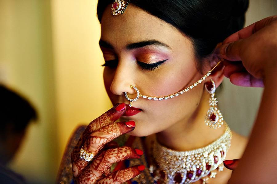 - В индийском свадебном макияже глубину и выразительность глаз подчеркивает сурьма, придавая им неповторимый шарм и загадочность. Стрелки обязательно выводятся за угол глаза, чтобы зеркала души смотрелись поистине бездонными озерами на прекрасном личике невесты. Что касается помады, то и здесь приветствуется то, что в нашем понимании называется излишеством. Да-да, в Индии золотое правило макияжа не работает – ярким на лице должно быть все! Так что невесты используют помады насыщенных красных и коралловых оттенков. Обязательны тонкие черные брови, густые пышные ресницы и, если необходимо, румяна, но только коричневого цвета.