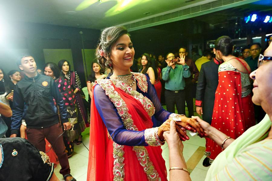 Первый день свадьбы жених и невеста празднуют раздельно в своих домах. Для каждого из них заготовлена своя церемония. На руки и ноги невесты наносят красивейший узор из хны — это церемония мехенди. У мужчины церемония называется халди. Его тело покрывают пастой из куркумы. Вечером начинаются танцы — сангит. В современной Индии сангит проходит совместно. Невеста и жених могут готовиться к этому заранее, записавшись на курсы к хореографу. К слову, они хорошо здесь зарабатывают, хотя танцы в два шага. Состоятельные семьи могут устроить коктейльную вечеринку. На столах могут быть алкогольные напитки, но это редкость. Как правило, на индийских свадьбах не бывает алкоголя.