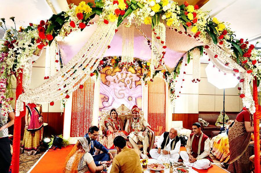 Сама свадьба в Индии начинается вечером дома у девушки. Для совершения обряда, согласно традициям строится специальный шатер. Его покрывают тентом, по углам ставят четыре пальмы. Шатер украшается живыми ароматными цветами, преимущественно желтых тонов.