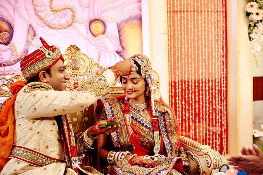Брахман (священник) читает молитвы, поет священные мантры, дает слово молодым для произнесения клятвы, после чего связывает руки молодой пары свадебной гирляндой из цветов, соединяя их души навеки, на все семь поколений. Как велит традиция, молодожены обходят вокруг огня семь раз. Отныне жених считает девушку своей женой, что подтверждает нанесением красной краски ей на лоб и пробор. Окрашенный красным пробор жители Индии называют «синдур».