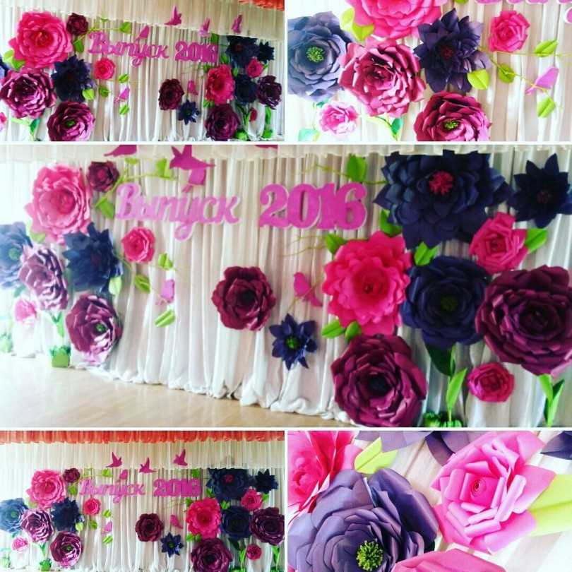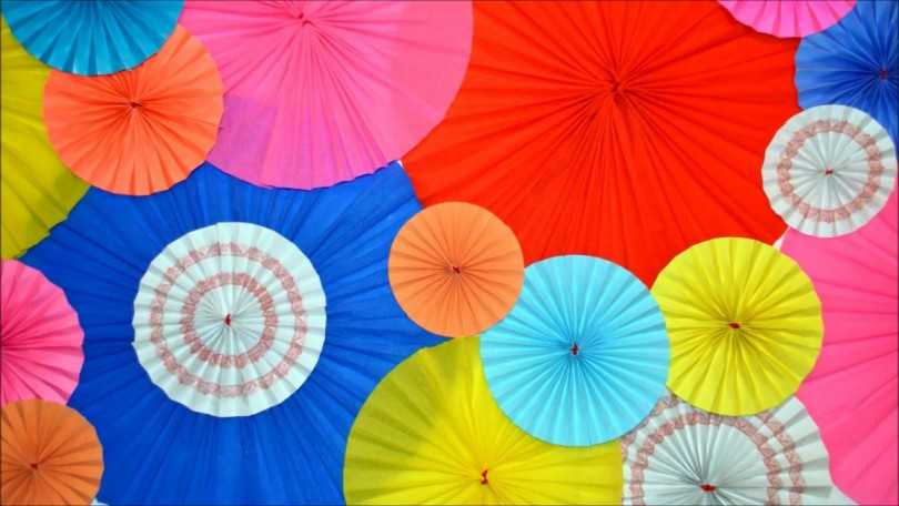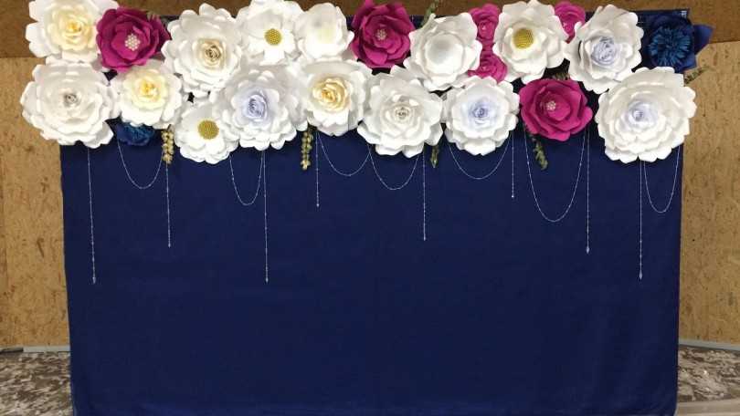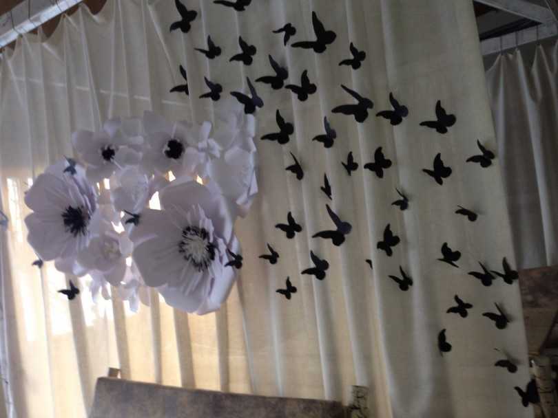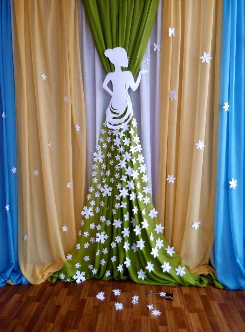 Украшения подвешиваются к потолку, крепятся к месту выступления, или вертикально на лентах по его краям. Есть вариант вырезать объёмные помпоны или шары. Их нанизывают на некотором расстоянии друг от друга на леску, толстую нитку или ленту, образующую гирлянду. Это будет прекрасным сюрпризом на торжество. Такие гирлянды легко крутятся от потока воздуха. Получается необычная «живая гирлянда».