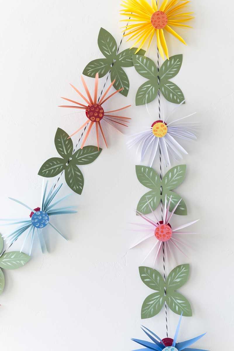 Для молодой девушки или утонченной натуры можно подготовить гирлянду из цветов, их легко сделать самостоятельно — для этого нужна цветная бумага, острые ножницы, клей, обычный карандаш, а также верёвка либо плотная нитка. Сначала на листке цветной бумаги необходимо нарисовать спираль, вырезать ножницами и аккуратно скрутить полоску так, чтобы сформировать из неё небольшой бутончик.