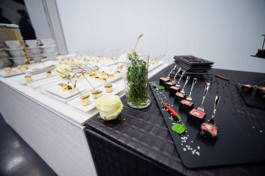 На фуршетах столики применяют исключительно для расстановки закусок и напитков. Еда красиво разложена и её можно легко достать. Поэтому ширина столов преимущественно небольшая. На современных фуршетных вечерах принято делать зонирование, при котором канапе и салаты находятся в одном месте, горячие закуски – на другом, а для напитков выделяется специальная поверхность (иногда это может быть барная стойка).