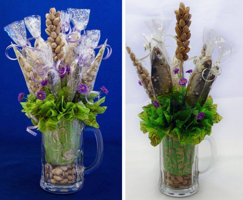 Из фисташек дома можно сделать удивительные поделки для презента — подсолнухи. А затем упаковать их вместе с баночками любимого пива, вяленой рыбкой и рыбной нарезкой. А если упаковать всё это на необычной подложке с еловыми ветками, такой презент можно подарить даже шефу!