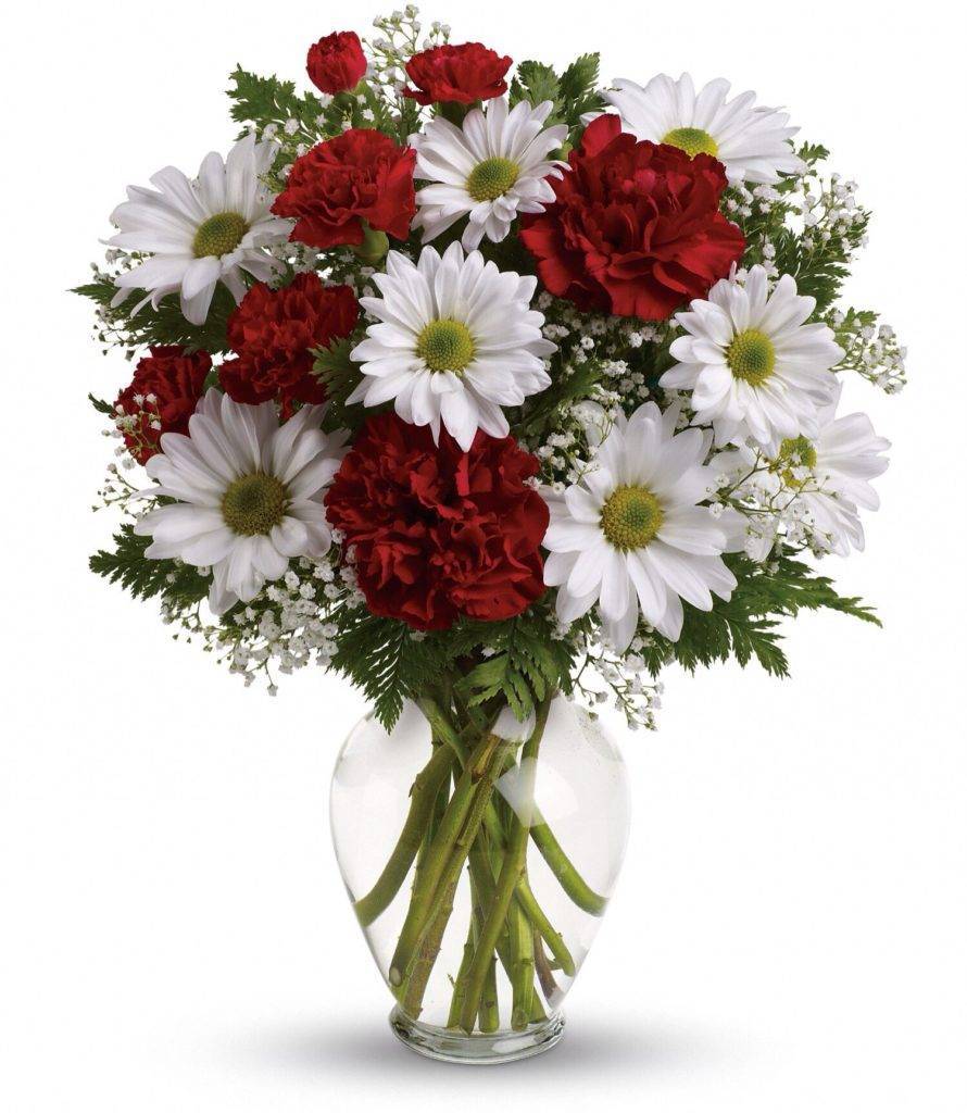 Алыми сердечками выглядят в букете ромашек красные гвоздики.