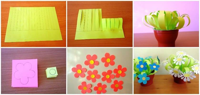 Как на счет чего-то необычного, предложите малышу принять участие в создании настоящего букета. Сделайте цветки в горшке из бумаги, смотреться он будет естественно и ярко.