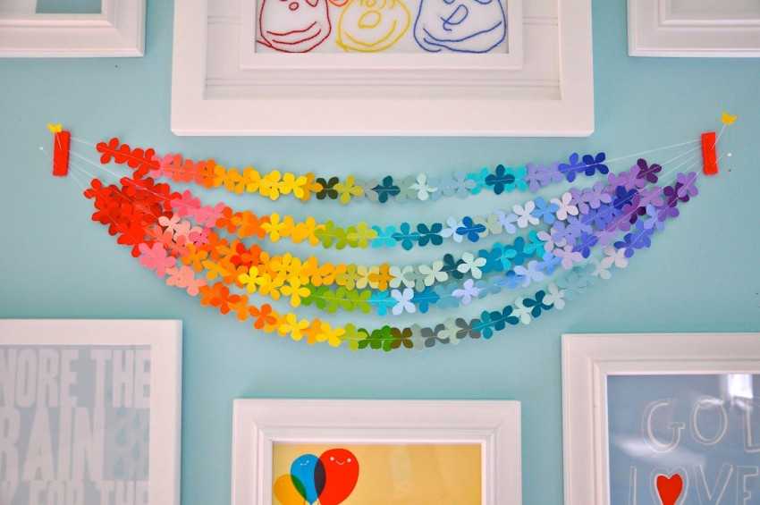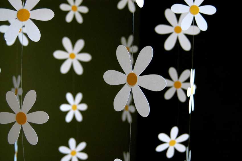 Удивительные гирлянды получают из бумажных цветов. Для этого понадобится красивый материал и немного терпения.