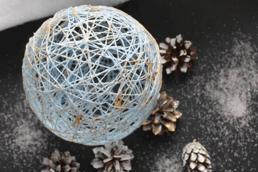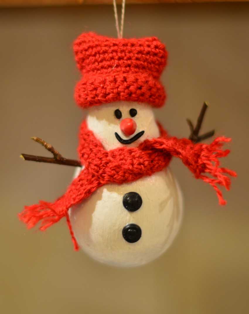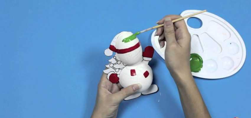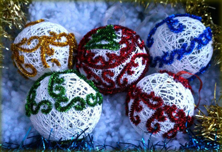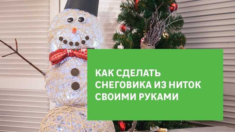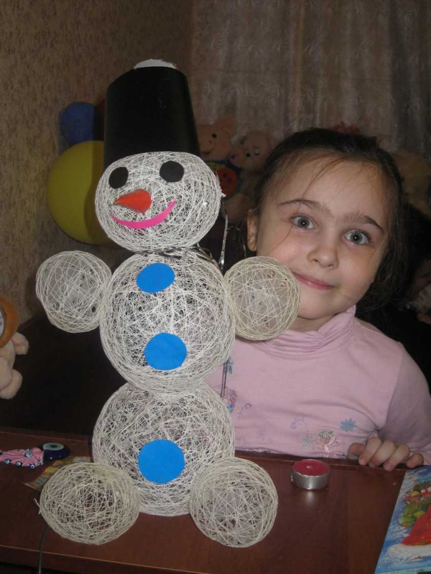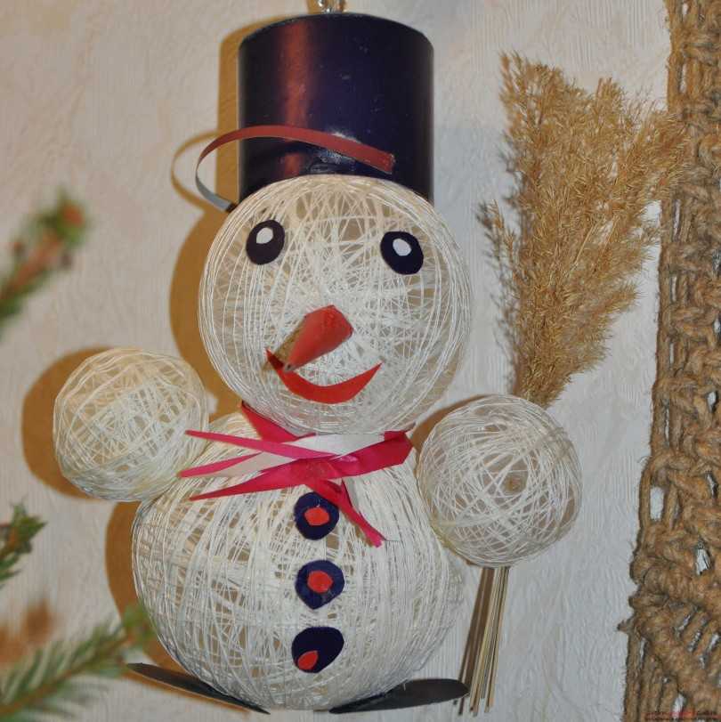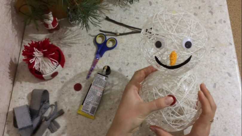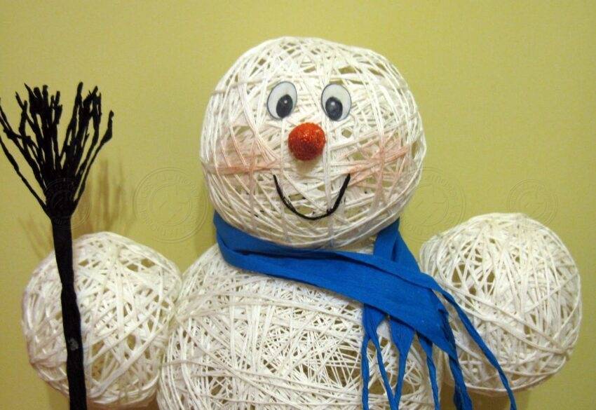 Чтобы сделать снеговика, надуваем шарики разного диаметра, хорошенько обмазываем их клеем (можно использовать кисточку), затем обматываем нитью в произвольном порядке несколькими слоями (каждый слой необходимо дополнительно промазывать клеем). После полного высыхания клея, шарик нужно проткнуть иголкой и вытащить из полученной формы.