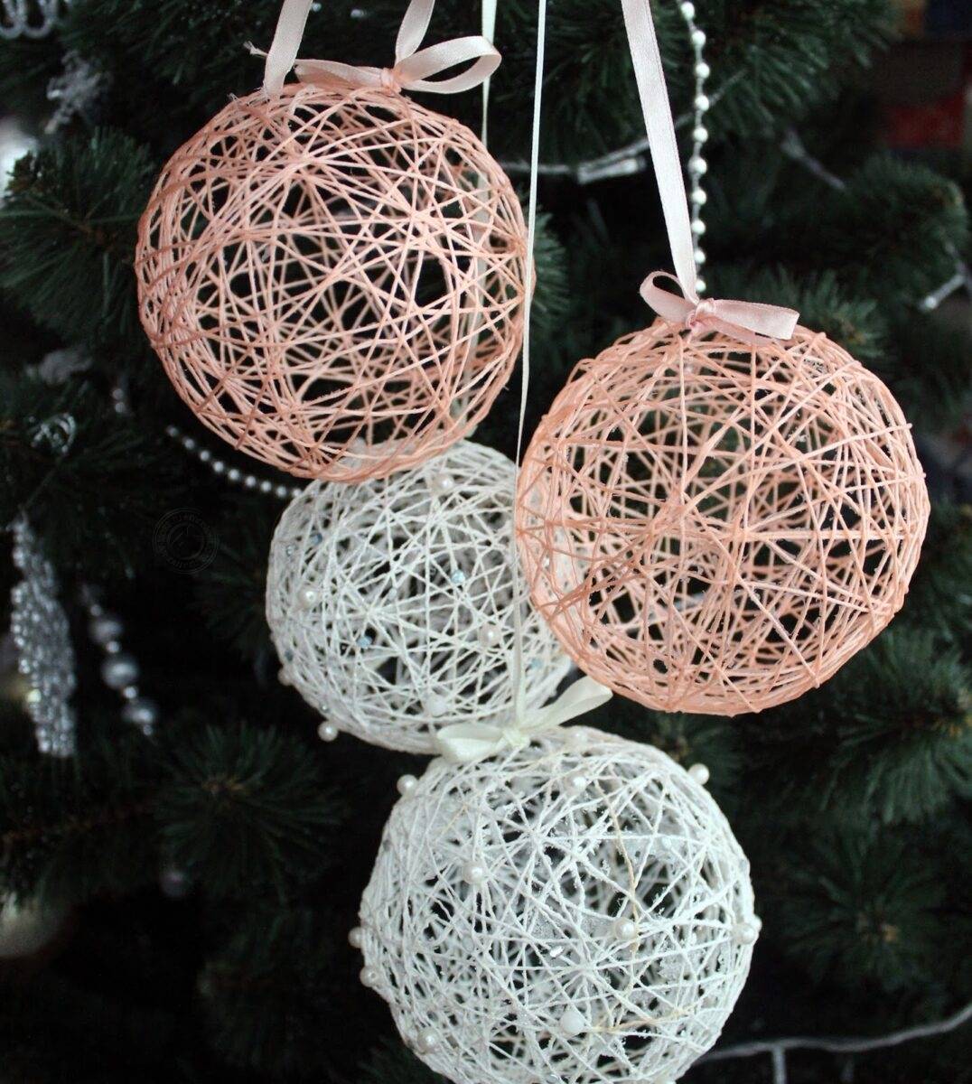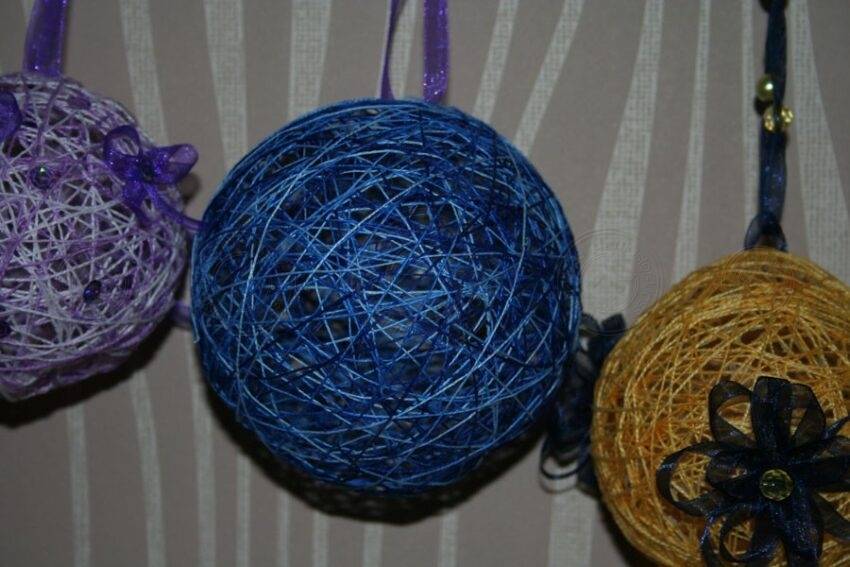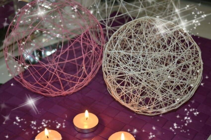 Изящные сферы развешивают на лестницах, арочных проёмах, соединяют в кольцо и гирлянды. Ещё один нетривиальный вариант выполняется из бумажной тарелки, у которой на дне вырезана треугольная фигура. Проделав по её контурным линиям дырки, в них продевают нитку, закреплённую с изнаночной стороны скотчем, и совершают обмотку пустоты, украшая композицию на своё усмотрение.