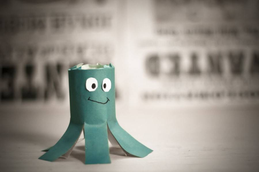 Осьминожку изготавливают из цветной бумаги, для работы понадобится клей и карандаш с ножницами.