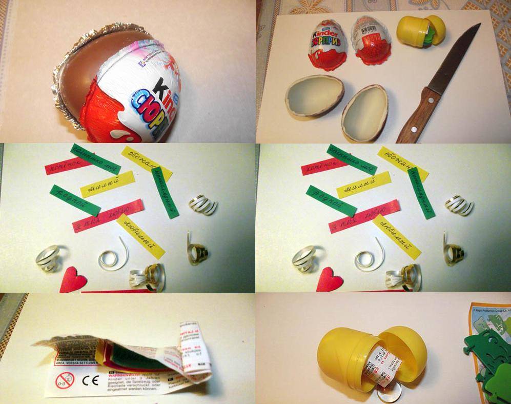Между прочим нам девушкам такие милые вещички очень нравятся. Мне еще очень понравилась такая забавная идейка сделать киндер. Смотрите, ведь в детстве все мы их очень любили. Снимите аккуратно обертку, а сам шоколад разрежьте напополам. В желтенький контейнер можно положить колечко или нарезать полоски и написать пожелания и нежные слова или любовные приколы.
