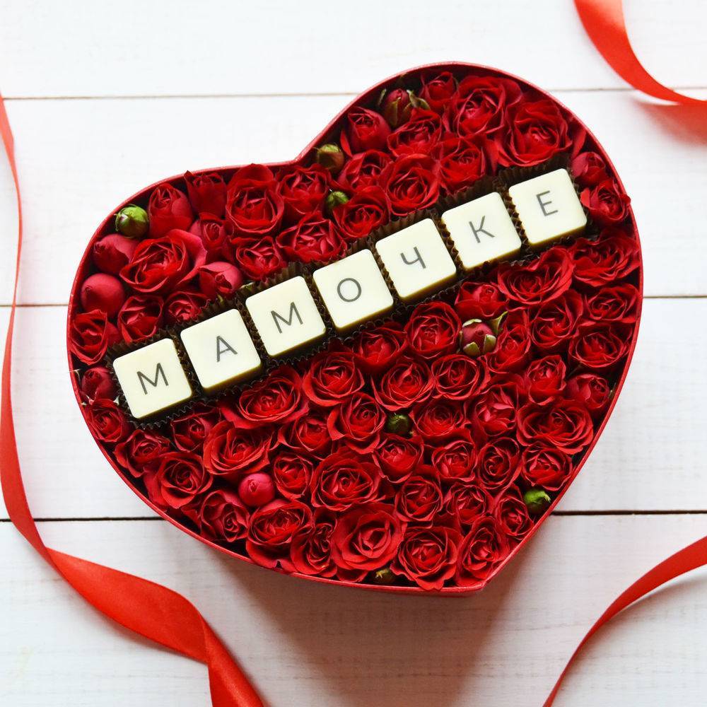 Корзинка с цветами и сладостями – можно организовать доставку такого сладкого украшения сразу на работу, обязательно приложить к нему открытку с теплыми пожеланиями. Мама получит массу положительных эмоций, сможет вкусно попить чай с коллегами и унесет домой роскошный букет.