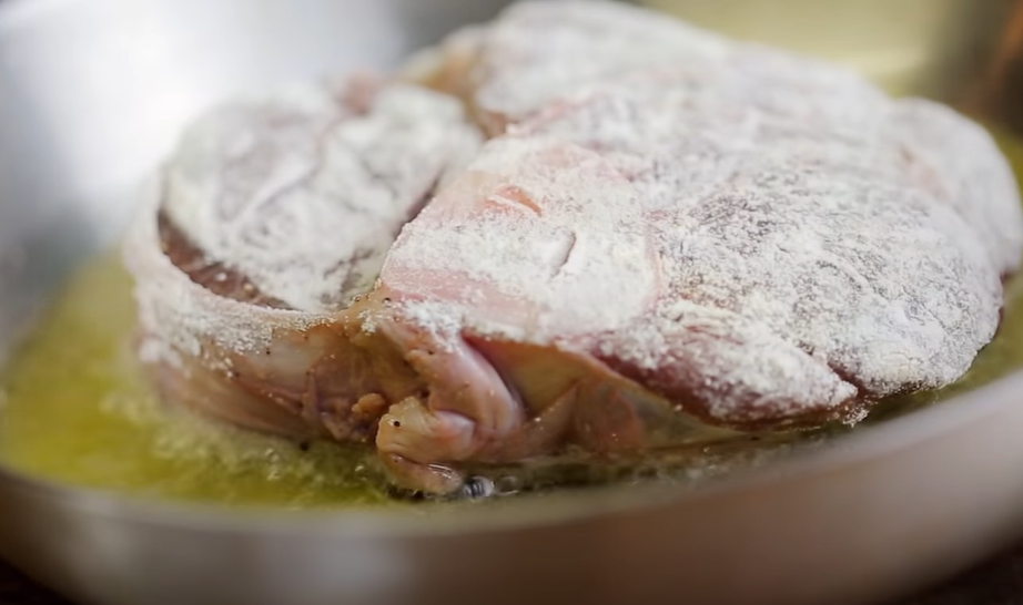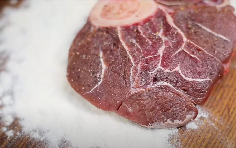 Лук, сельдерей и морковь нарезаем крупными кусочками. Широкими ломтиками режем телячью рульку, солим, перчим и обваливаем в муке.