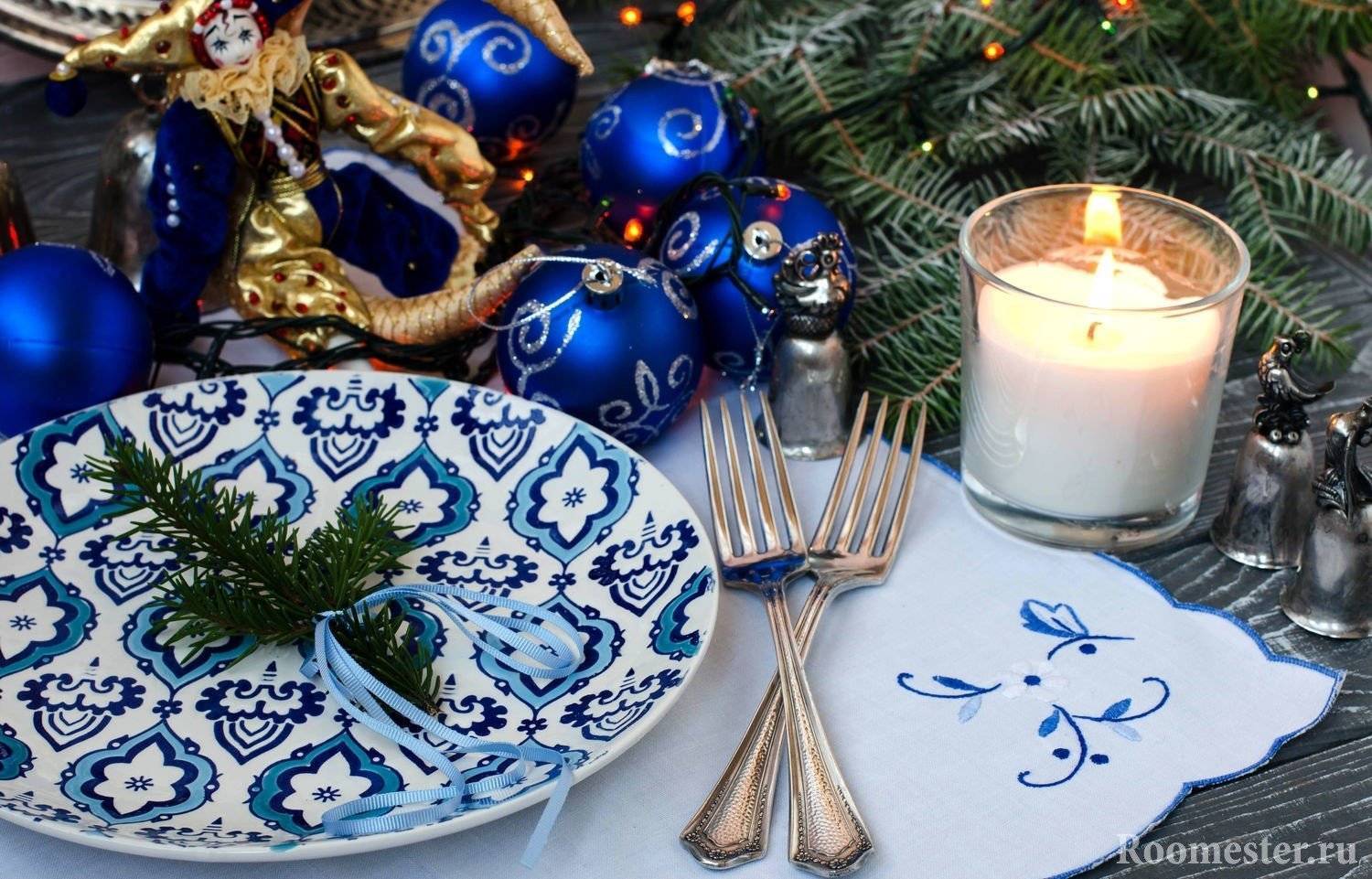 Основная широкая тарелка должна быть красивейшей и с новогодним сюжетом (на ней размещаются остальные тарелочки при перемене блюд). Хорошо, если это сервиз. Но в отсутствие подобного выручит набор в белом цвете, который временно нетрудно преобразить, используя наклейки, фольгу, блестки.