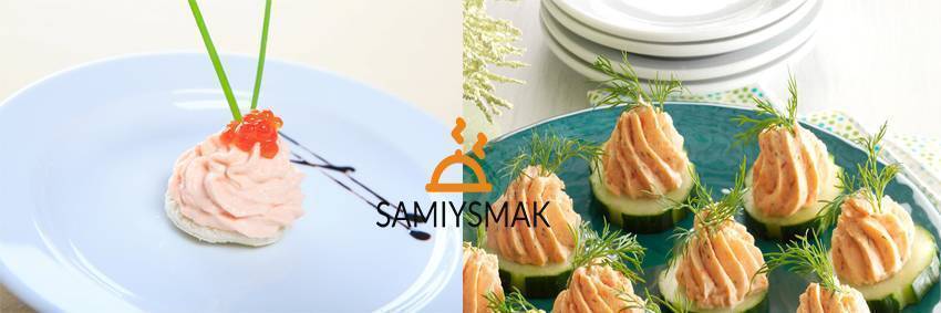 - Получившийся мусс поместите в кулинарный мешок. Выдавите на канапе мусс. Украсьте икрой и подавайте к столу. Есть вариант взять вместо красной икры рубленую зелень.