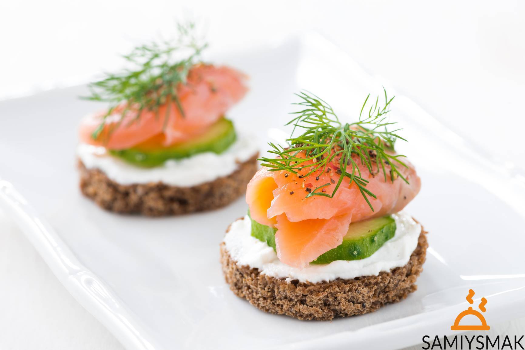 - Ломтики слабосоленой семги сверните рулетиками. Положите сверху огурца. Посыпьте специями, рубленым укропом.