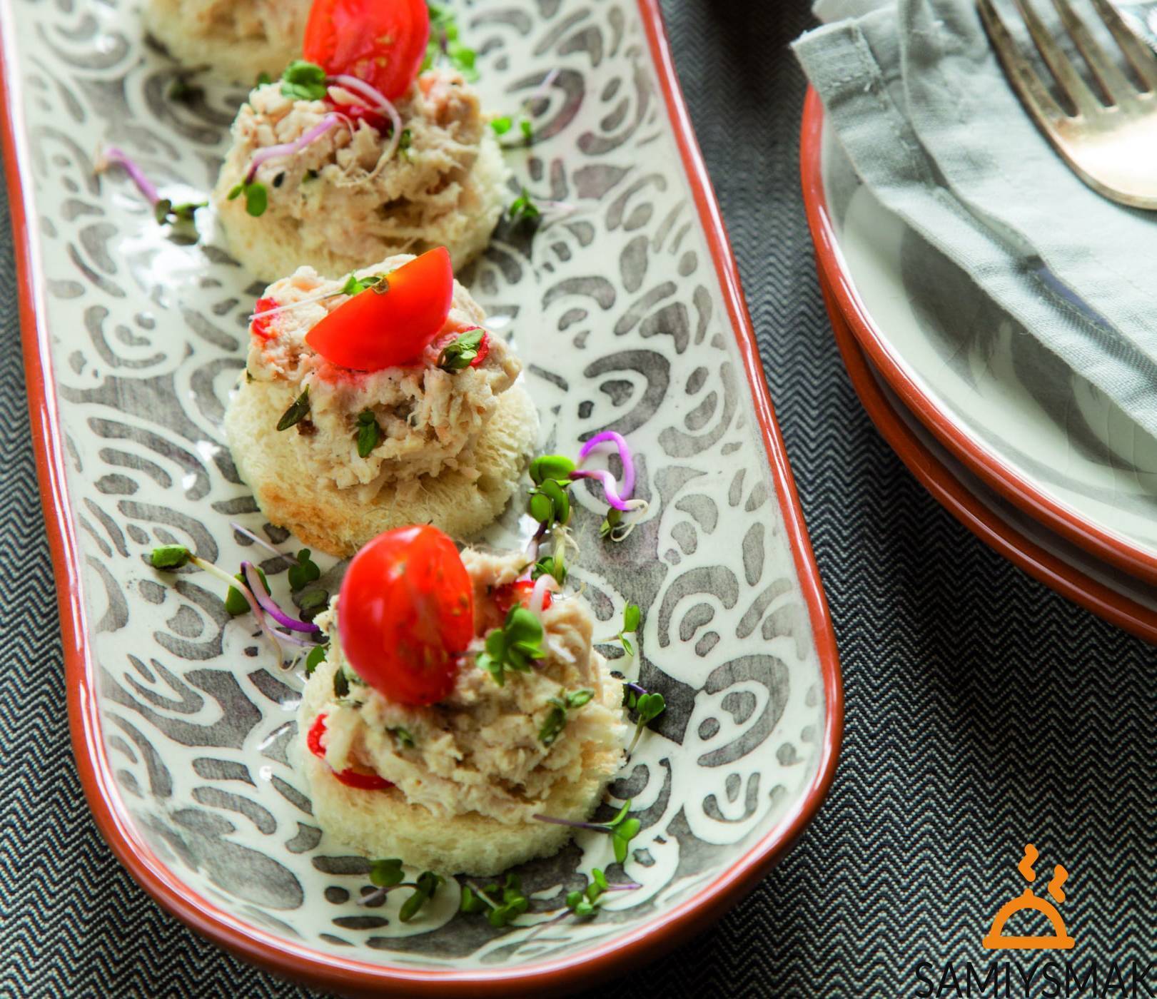 - На канапе выложите получившийся крем. Украсьте нарезкой помидора, зеленью. Получилась закуска для любого праздника.