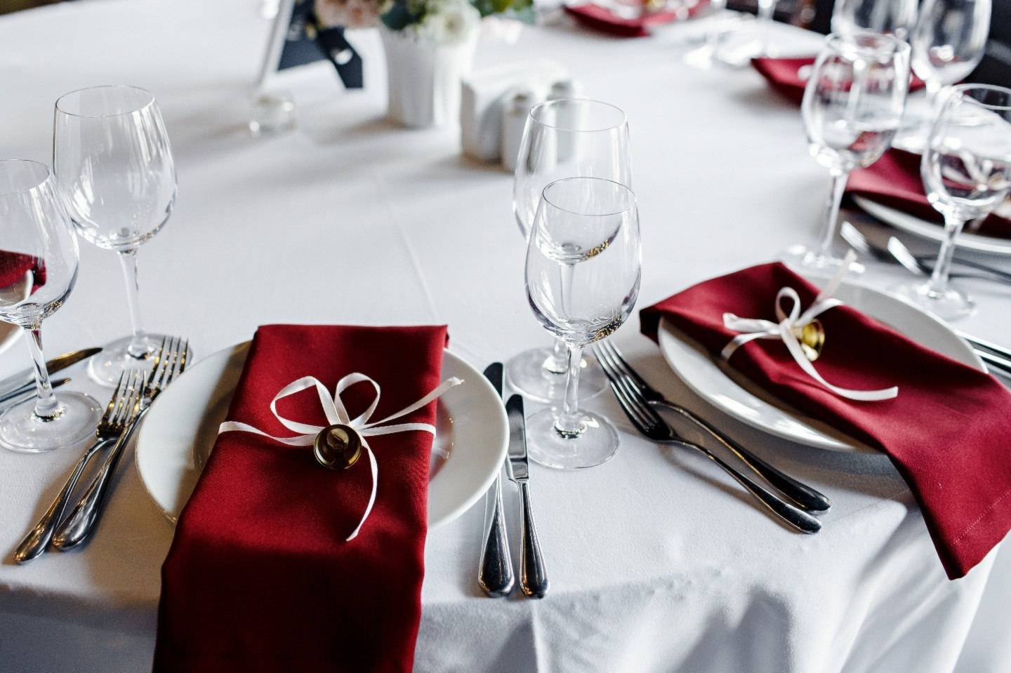 - Каждый стол в зале можно оформить в определенной цветовой гамме, а на стулья надеть белые чехлы, перевязанные лентами. Особую изюминку оформлению придадут разноцветные цветы в вазах, посуда и салфетки.