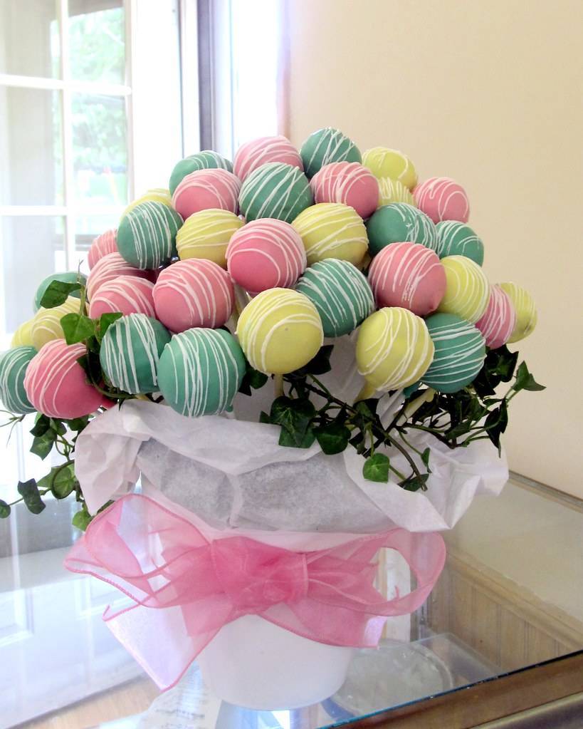 Отличной вариацией оригинального подарка будет композиция из сладостей в горшочке. Тут, естественно, понадобится горшочек. В него вклеивается пенопласт и втыкаются сладости по описанной выше технологии. Можно всю заготовку покрыть именно чупа-чупсами или внести разнообразие. Добавьте какие-нибудь интересные элементы, внесут разнообразие также завернутые в розу из гофробумаги сами чупа-чупсы. Композиция будет смотреться интереснее при наличии разных украшений. В таком букете можно спрятать драгоценности в подарок.