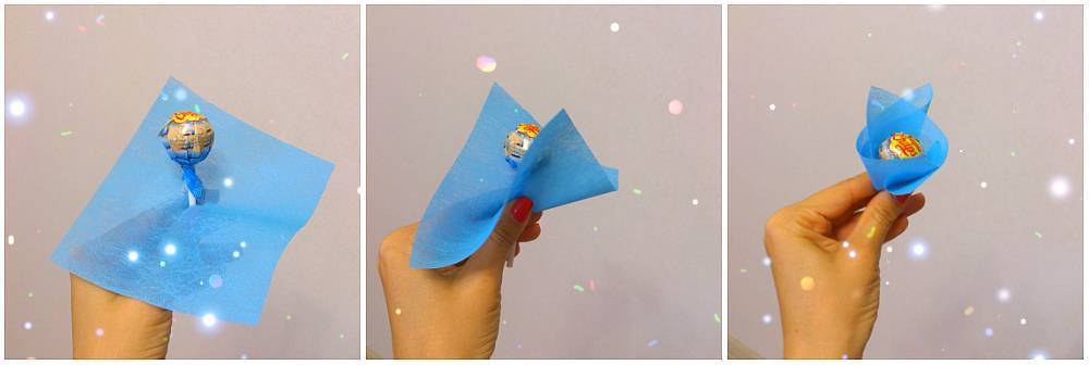 Режем упаковочную бумагу на квадраты (мои квадраты получились примерно 10 на 10 см). Квадратов делаем столько, сколько всего чупа-чупсов. Делаем в центре каждого квадратика надрез для продевания через него чупика. Надеваем на чупик упаковку и складываем как показано на картинке (два раза пополам). Когда упаковка сложена, завязываем красивой лентой узелочек для закрепления упаковки на палочке чупа-чупса.