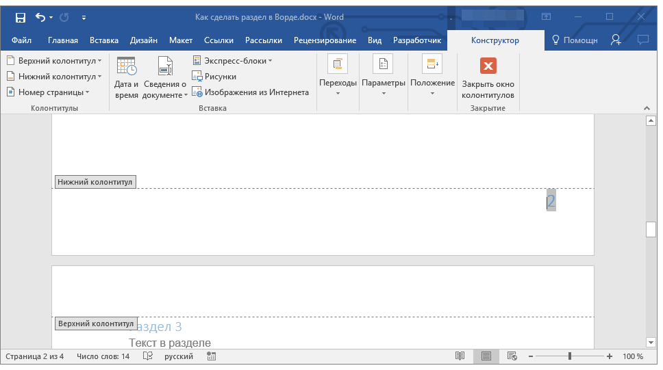 Наряду с нумерацией страниц, которая, как известно, располагается в верхних или нижних колонтитулах страниц, при работе с разделами также может возникнуть необходимость изменения этих самых колонтитулов. О том, как их изменить и настроить вы можете прочесть в нашей статье.
