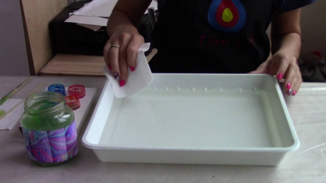 Берем умеренно глубокую емкость прямоугольной формы, заполняем водой не до краев. Использовали готовые краски, рекомендуемые для начинающих Artdeco. Но можно использовать краски (бойалар).