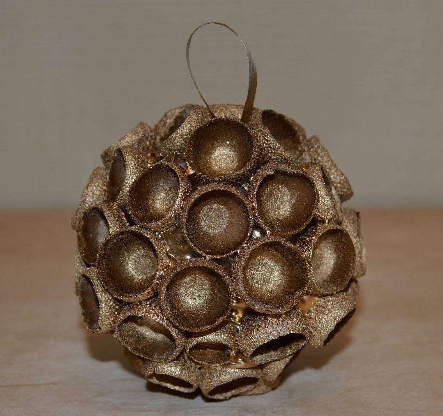 Подготовленное ядро красим в коричневый цвет и приклеиваем шляпки хвостиками к шару. Заполнять пространство необходимо как можно плотнее. Место одного впалого элемента займет крючок крепление из проволоки. Декорировать игрушку можно при помощи силикатного клея и блесток, красивых бусин внутри шляпок, ленточек.
