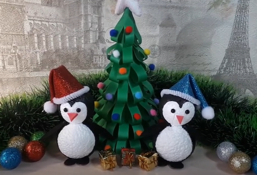 К шапочке приклеиваем помпон, нижнюю часть колпачка по периметру обклеиваем мишурой на проволоке. Шапочка готова, приклеиваем ее к пингвину.