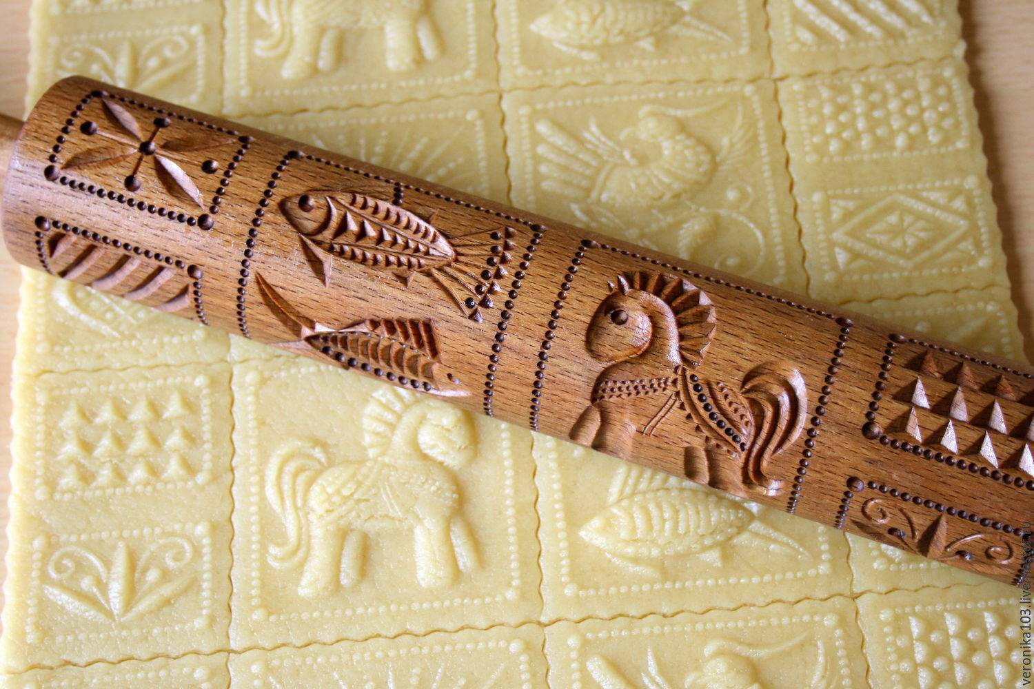 - Деревянная скалка с рельефным рисунком позволит украсить выпечку.