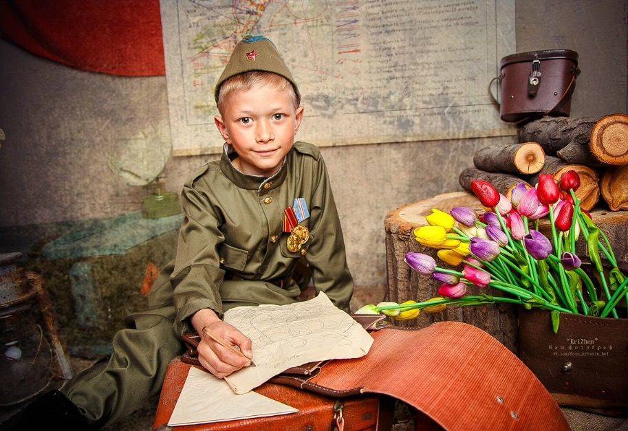 Также в преддверии Дня Победы в сады и школы приходят фотографы и предлагают тематическую фотосессию. Если фотосессия будет проходить без родительского присутствия – не забудьте снять с детей вещи, которых не могло быть в те годы (смарт часы, некоторые виды бижутерии и т.д.), так как это может испортить впечатление в готовом результате.