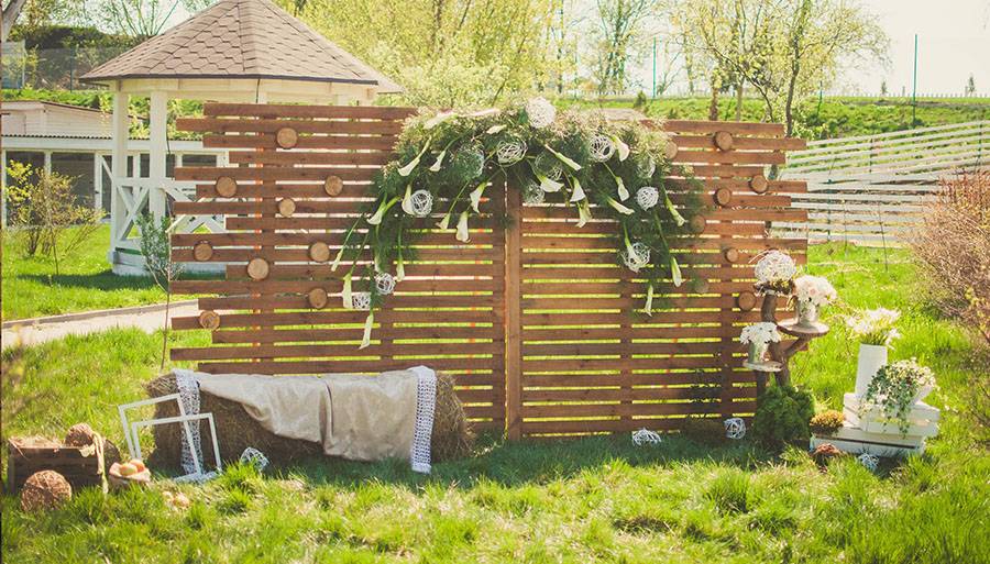 - Забор. Он идеально подойдет для создания фотозоны на выездной регистрации. С его помощью ее можно отделить от места проведения банкета. Для украшения забора подойдут живые цветы и речевые облака. Осенью можно использовать георгины и пионы. Сам забор может быть выполнен из картона или дерева.