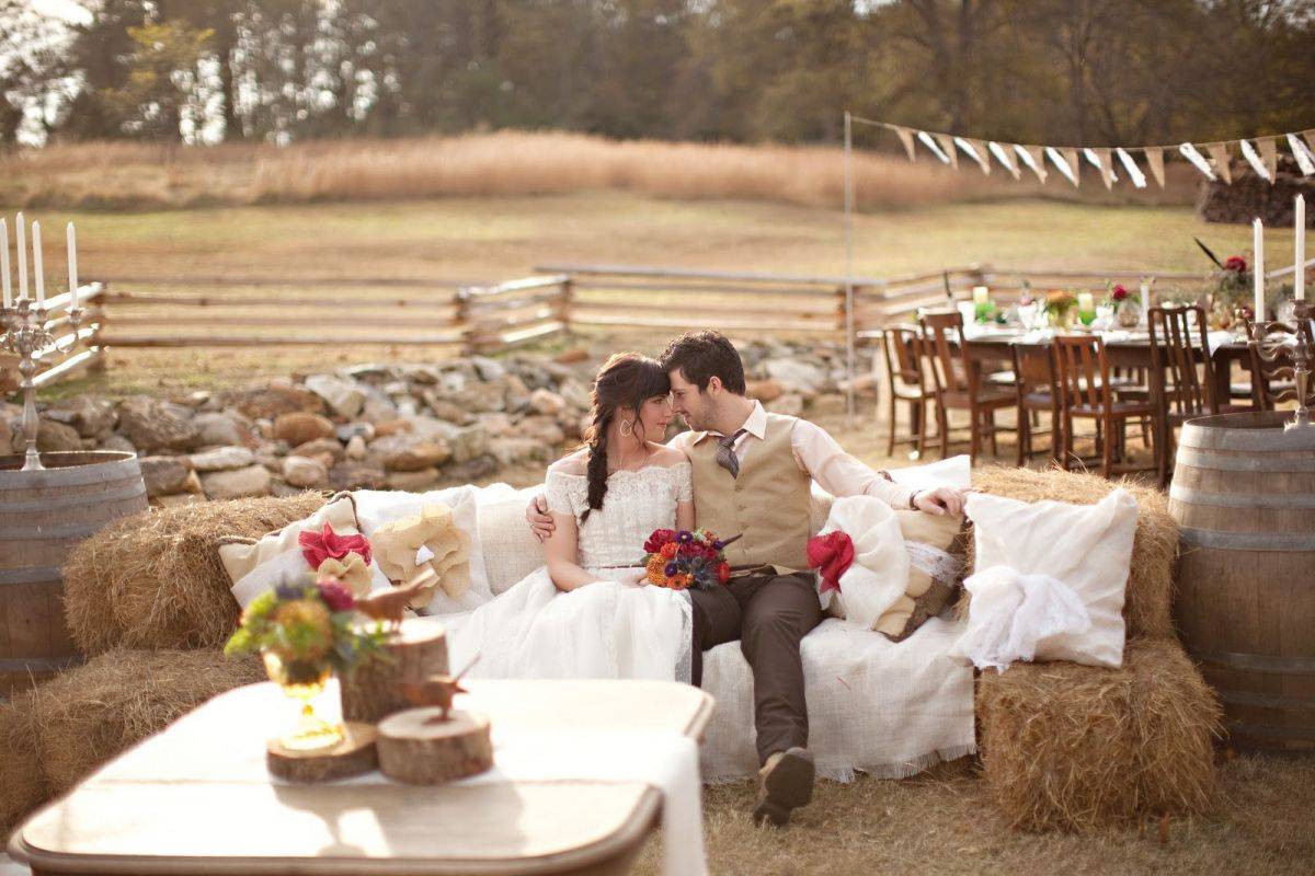 Если вы празднуете свадьбу в загородном участке на открытом воздухе, то можете в качестве фотозоны сделать целый уголок с диваном, изготовленным из сена, деревянным столиком и бочками. Украсить все это можно подушками, покрывалами и нежными цветами.