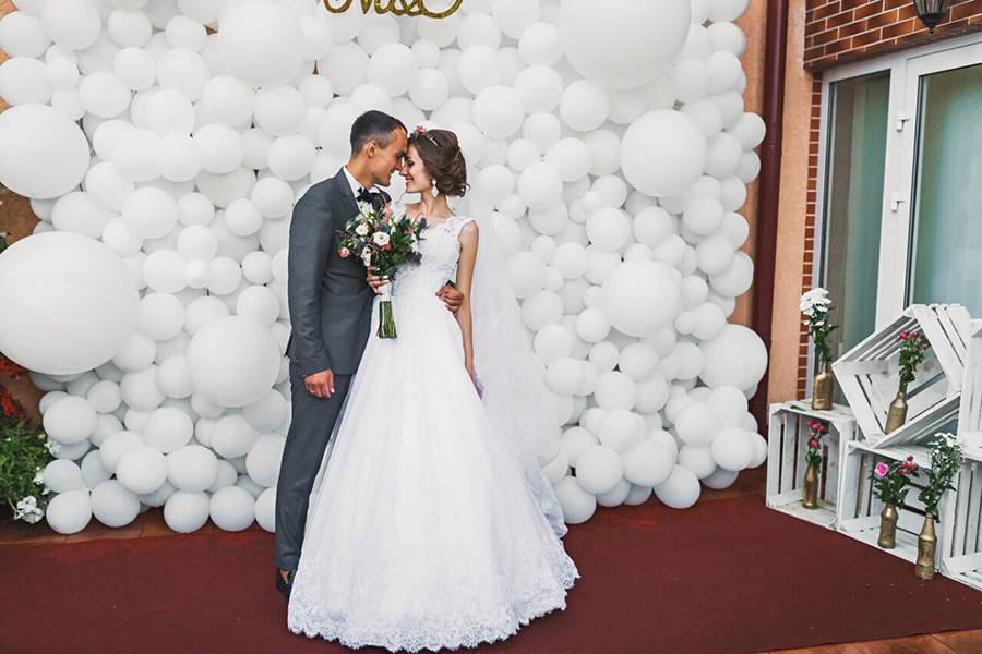 - Гелиевые шары. При помощи этого незаурядного украшения можно создать фонтаны из шаров. Тогда гости смогут сделать фото, на которых они как будто утопают в них. Не стоит использовать для украшения слишком яркие шары. Так приглашенные и молодожены в нарядной одежде просто потеряются на их фоне. Как сделать фонтан из шаров вы можете прочитать в другой статье.