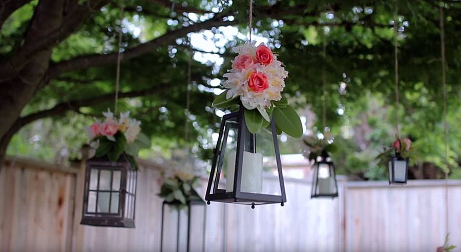 Сделайте из дерева рамку в старинном стиле. В нее вставьте искусственные цветы и зелень, можно также добавить простые тонкие веточки. Подвесьте эту рамку к дереву в красивом саду.