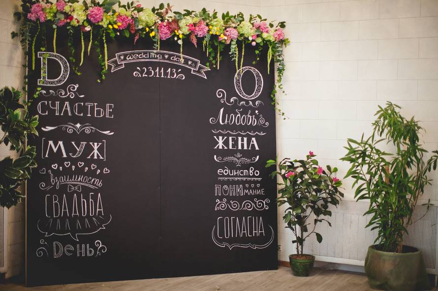 - Грифельная доска. Для ее создания можно использовать металлическое или деревянное основание. Ему нужно придать форму прямоугольника размерами 2х2,5 м. Главное условие – оно должно быть выше, чем невеста и жених. Такой фон будет красиво окрасить в черный цвет. На нем следует написать мелом: имена молодоженов, признания в любви, пожелания гостей и нарисовать сердца.