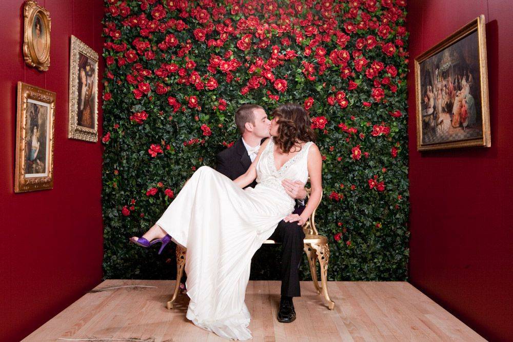 Можно сделать мини-комнату, 2 стены в которой заклеить классическими обоями с картинами, а одну главную стену задекорировать цветами и искусственной зеленью. Отметим, что это достаточно необычный способ сделать фотозону, который летом встретишь нечасто, но, если ваша свадьба проходит в дождь или в снег — то это отличный вариант.