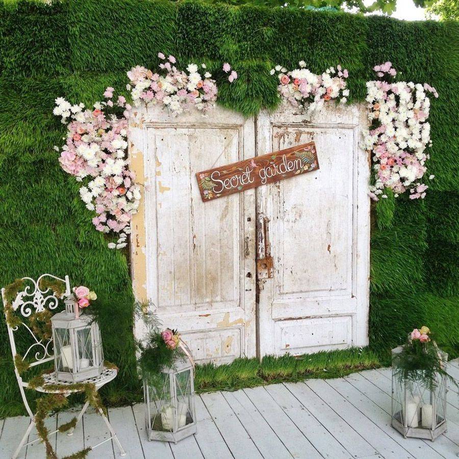 Вот так обычные старые двери можно превратить в бесподобную фотозону в классическом стиле. Украсить все это можно старинными фонарями и искусственными цветами в пастельных тонах. На дверь можно повесить табличку с именами молодоженов или датой их свадьбы.