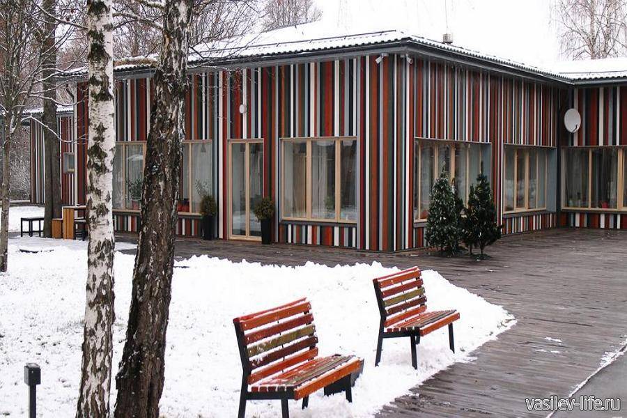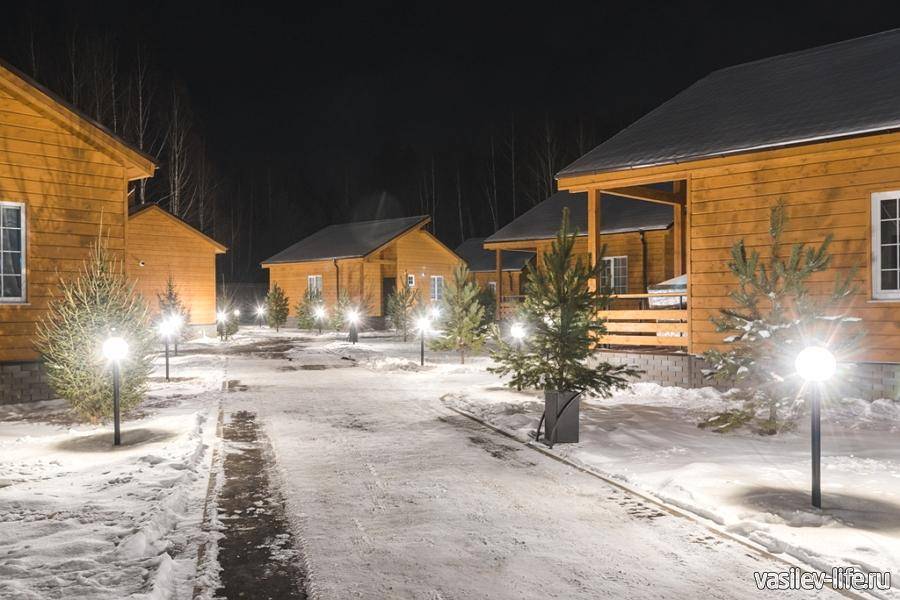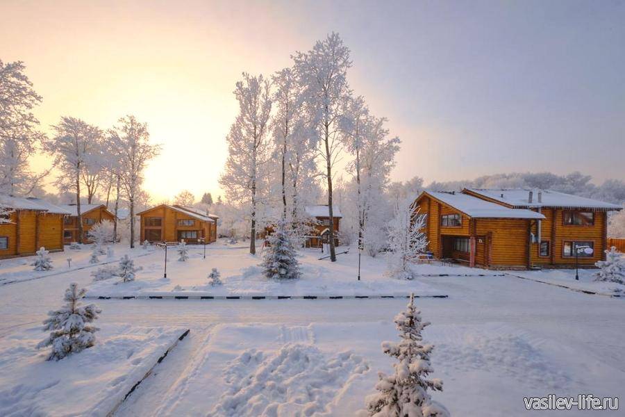 На территории комплекса семейного отдыха можно отлично встретить Новый год 2021 с друзьями. Для проживания предлагаются коттеджи с одной или двумя спальнями и гостиной. Некоторые варианты имеют собственную сауну. На территории имеется ресторан русской кухни, где подаются блюда из морепродуктов, русская баня с бассейном. Коттеджи располагаются на берегу пруда, что особенно ценят заядлые рыбаки.