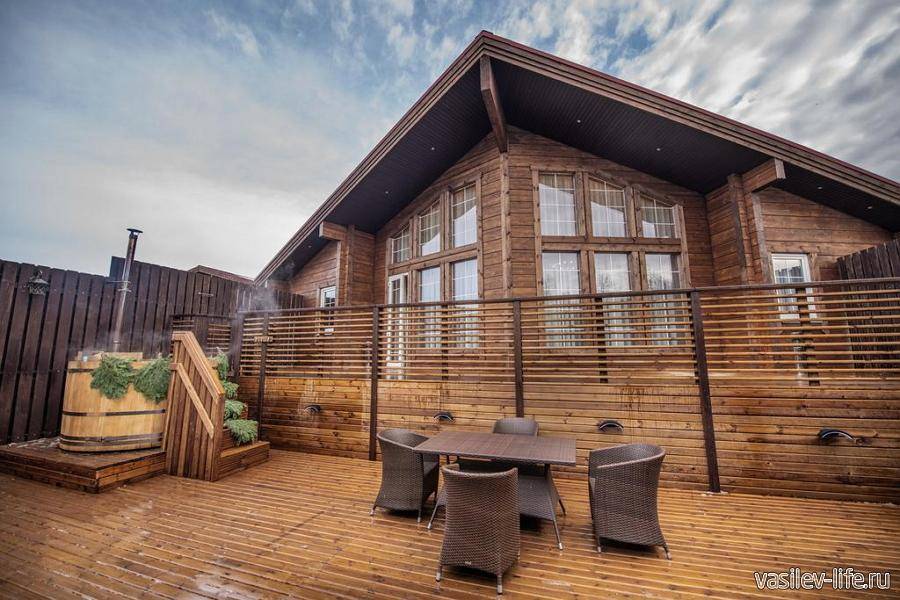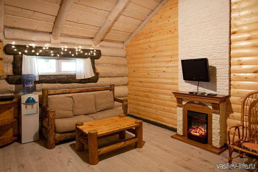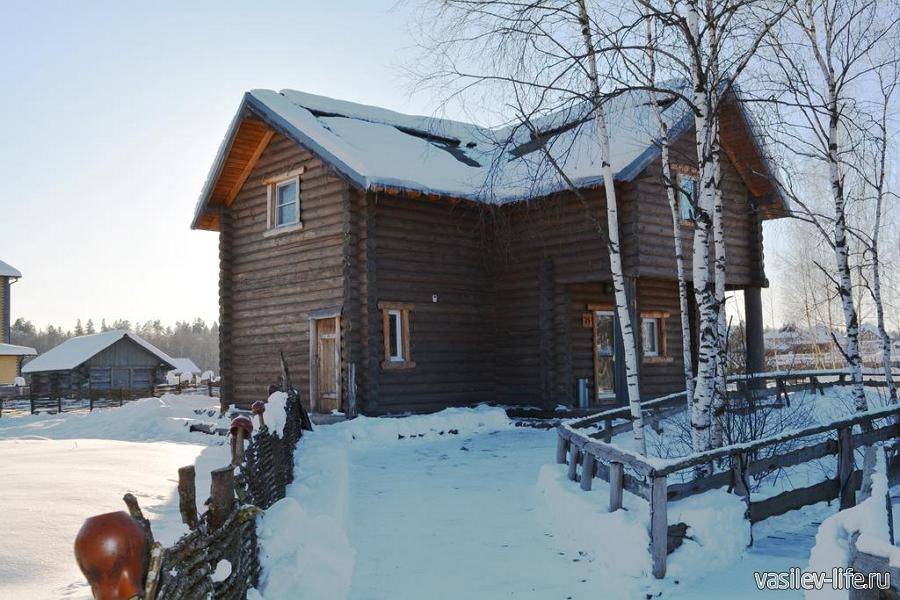 Благоустроены дома с одной, двумя или четырьмя спальнями станут отличным вариантов встречи Нового года в кругу друзей. Деревянные дома выполнены в старорусском стиле — теплые, уютные, оборудованные всем необходимым, включая бытовую технику, посуду, постельное белье и так далее. На территории есть сауна. Есть пруд, в котором можно порыбачить. В стоимость проживания, в некоторых вариантах, входит рыбалка, в других – посещение сауны.