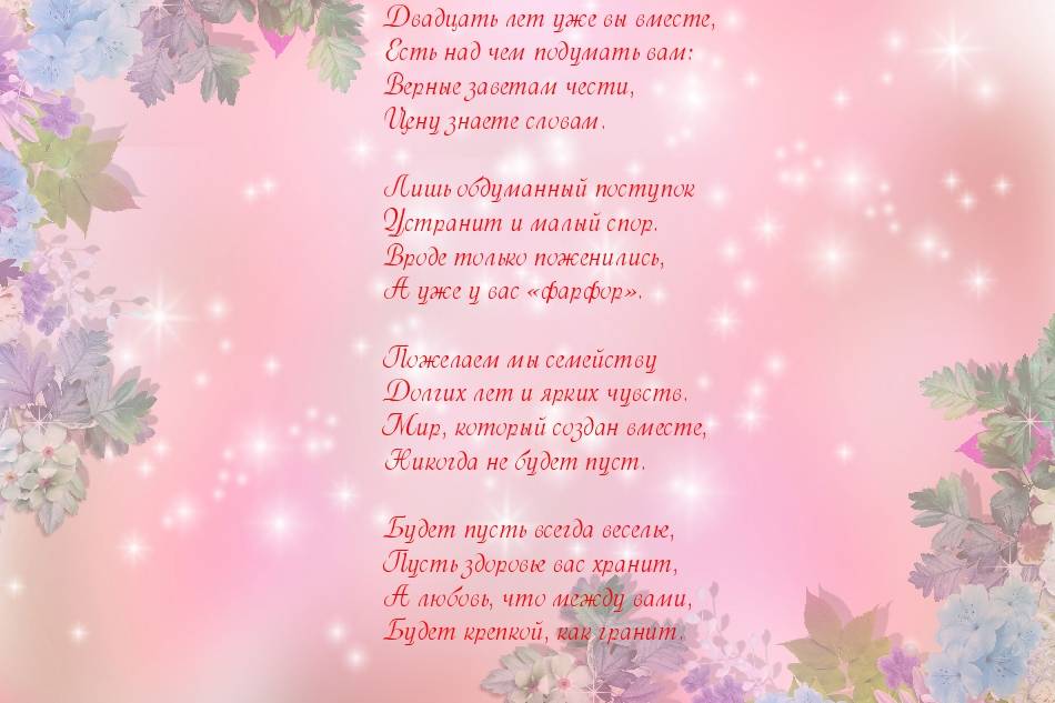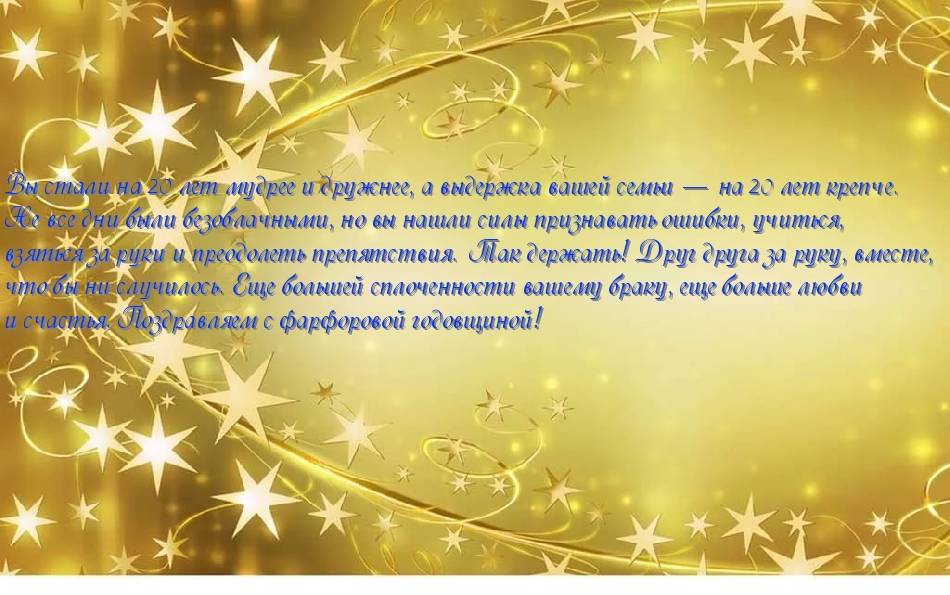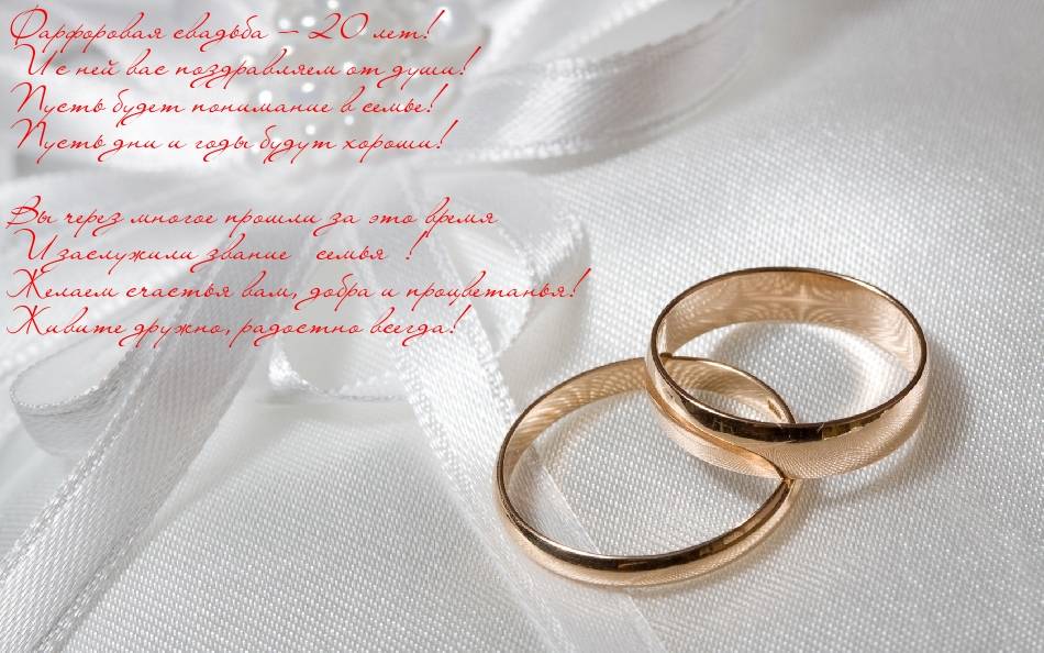 Когда супруги отмечают фарфоровую свадьбу, то оформление зала, где проводится торжественный юбилей, оформляется в нежных белых и кремовых оттенках. В эту дату родственники, друзья и дети не скупятся на теплые слова и подарки. И если сложно подобрать сокровенные поздравления с годовщиной свадьбы, когда мужчина и женщина отмечают 20 лет совместной жизни, можно воспользоваться уже готовыми вариантами: