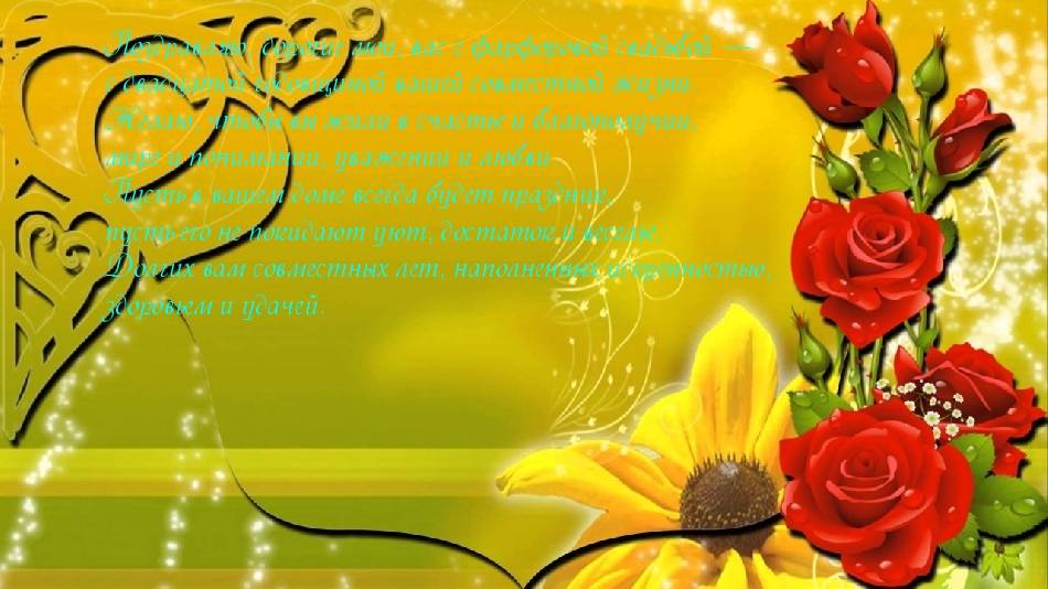 - Все лучшее для фарфоровой свадьбы! Желаю, чтобы вам предстояли самые счастливые годы жизни!