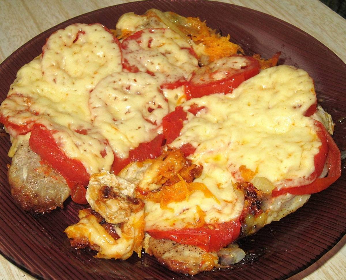 Отбивную часть свинины разрезать на порционные кусочки, не дорезая до конца. Между ними вставить кружечки помидор и пластинки сыра. Мясо смазать специями, положить на противень. Взбить яйца, добавить майонез, залить свинину.