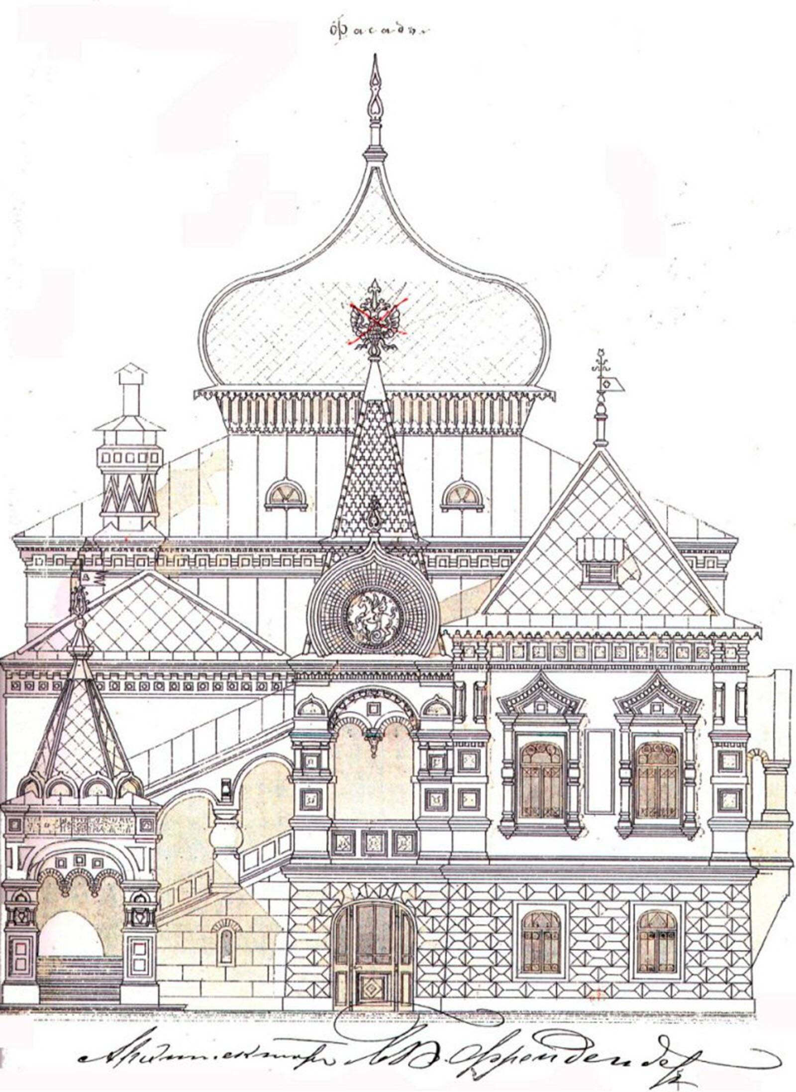 Здание было решено строить в модном тогда псевдорусском стиле, или, как его еще называли, стиле русского модерна. За вдохновением Петр Щукин и Борис Фрейденберг ездили в Ярославскую губернию — там они изучали образцы русской архитектуры.